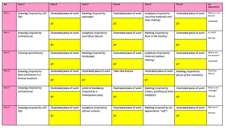 mastery in drawing, painting and sculpture, (including experience of other additional art forms and working with an artist in residence as part of the Royal Shakespeare Company project in Year 5),