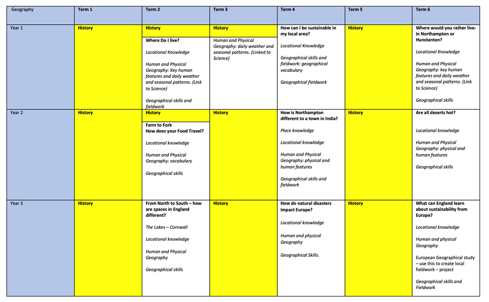 The foundational geographical knowledge taught within the Early Years is built upon throughout Key Stage 1 and then Key Stage 2.