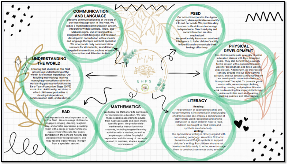 Our curriculum is specialised and adapted to suit the needs of our learners as individuals. All learners within The Nest will have or will be on the path to receiving an EHCP. Targets from this will form the basis of our learning, being used to create and individualised learning plan (IEP) for each child. Children will have personal targets for all areas of learning; these will be worked on through a combination of taught sessions and structured play.