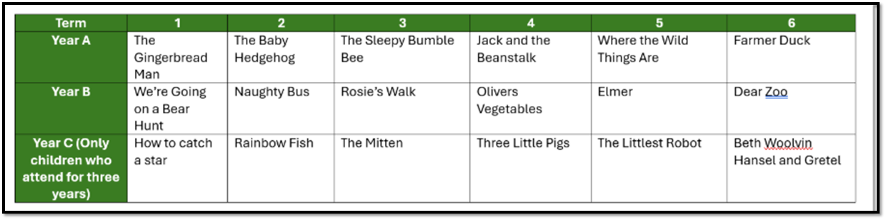 As in the main school and The Hive, our writing will be taught through the SEND adapted Talk for Writing Approach. Following the 3 I’s, Immersion, Imitation and Innovation, the children will learn an adapted 5 sentence story of the text. Each step of the learning journey will be linked to a key Talk for Writing text, these are in line with our mainstream curriculum or that of our specialist unit. These texts will run on a two-year rolling programme as many of our children will stay with us for two years. There is also a third year, closely linked to Year 1, for those who are with us for three years. Please see table for details: